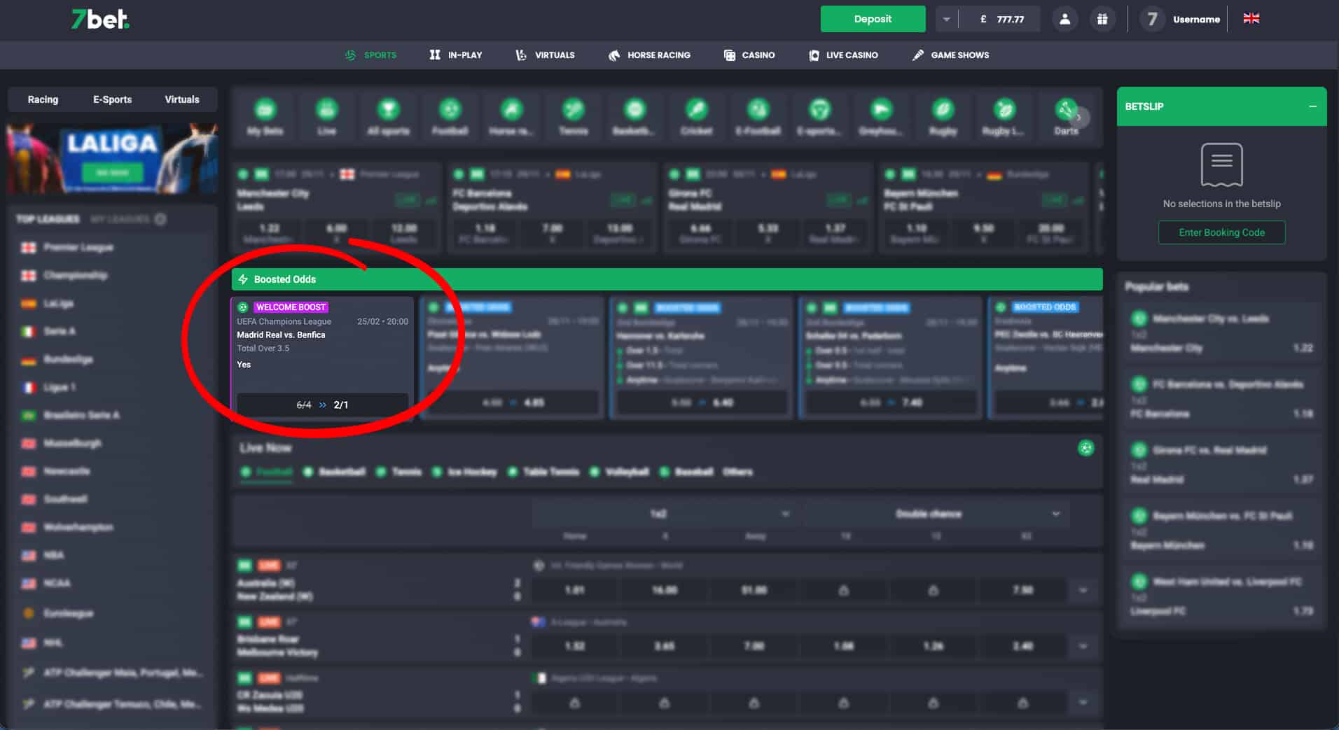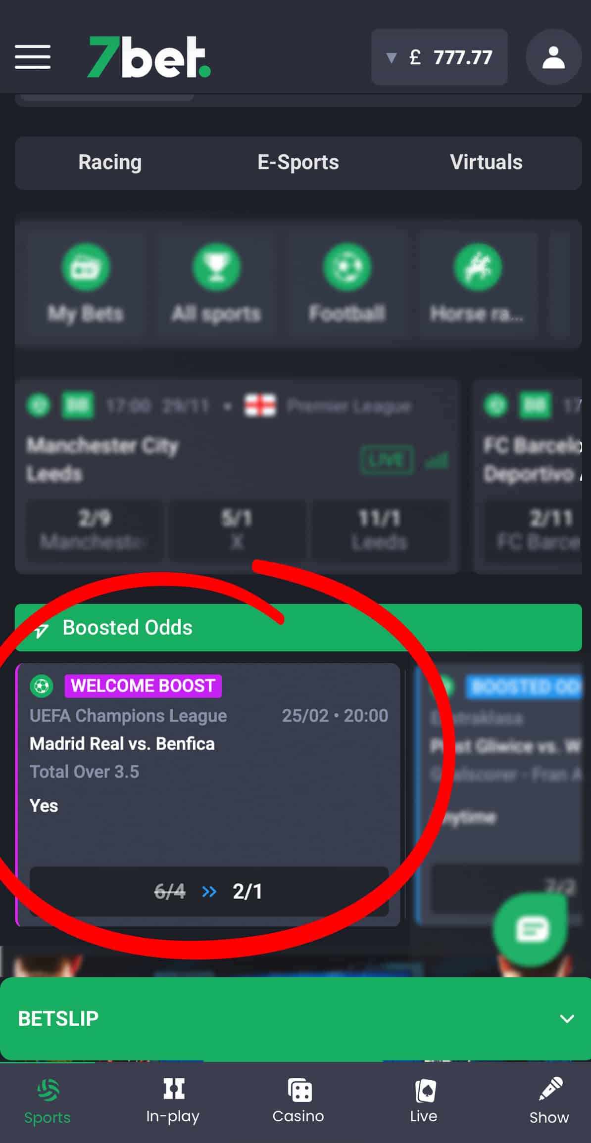 Once you register and log in, the Welcome Boosted Odds offer will be displayed on the Main 7bet Sportsbook page, in the first position of the boosted odds section.