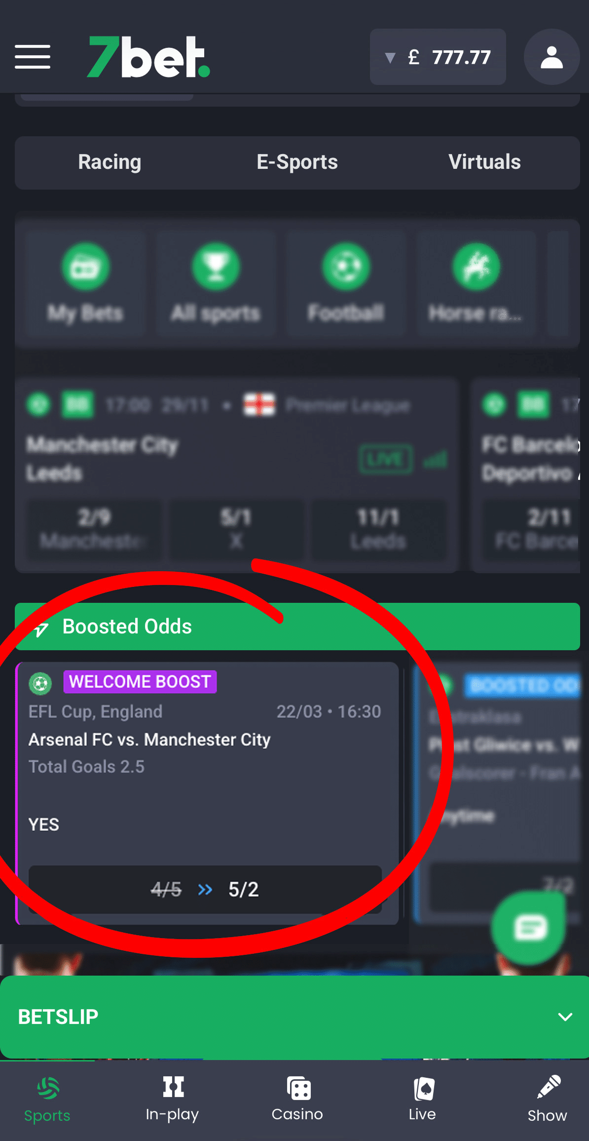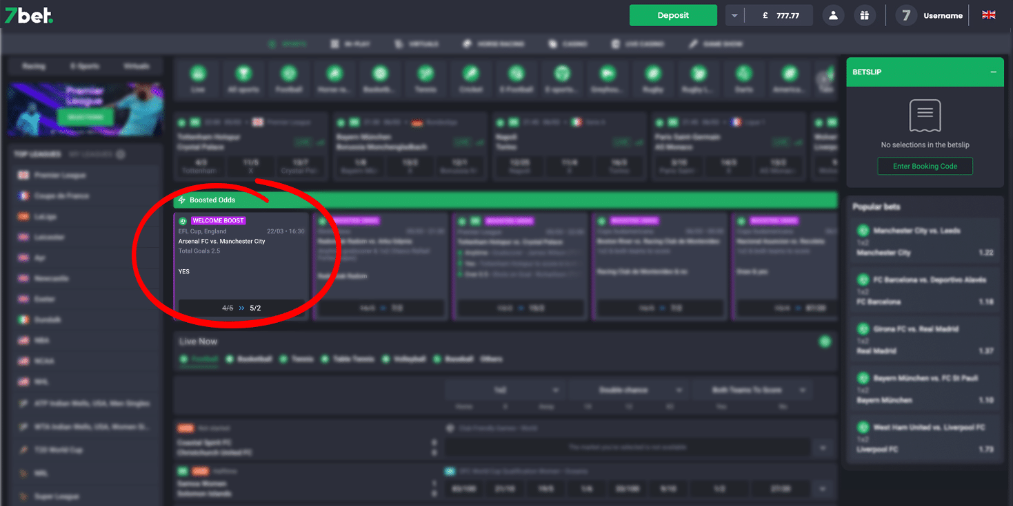 Once you register and log in, the Welcome Boosted Odds offer will be displayed on the Main 7bet Sportsbook page, in the first position of the boosted odds section.